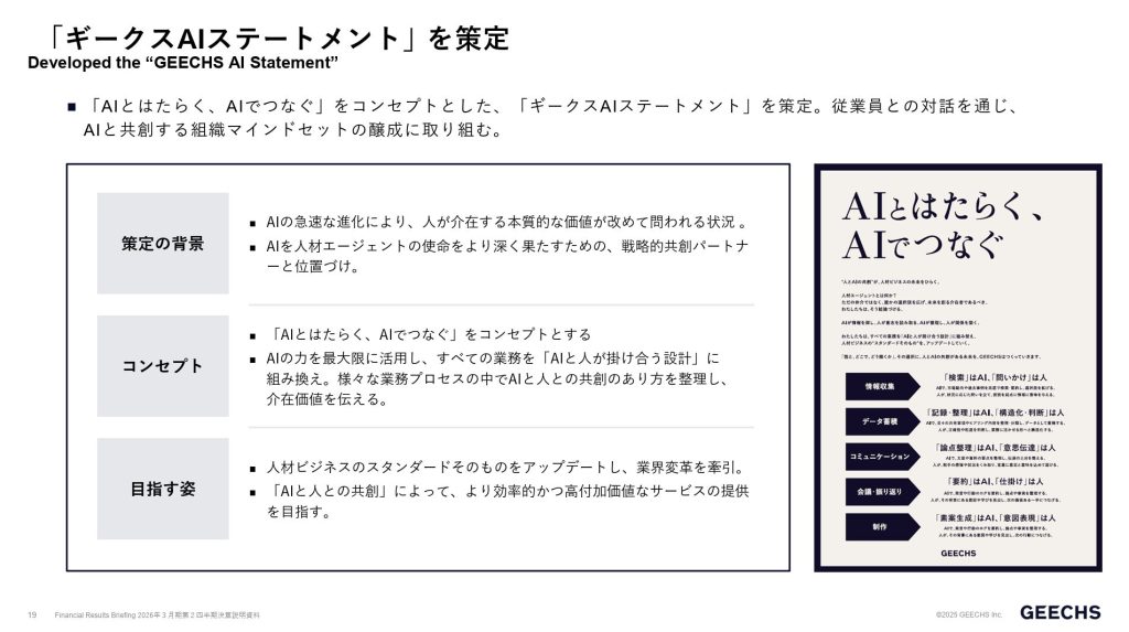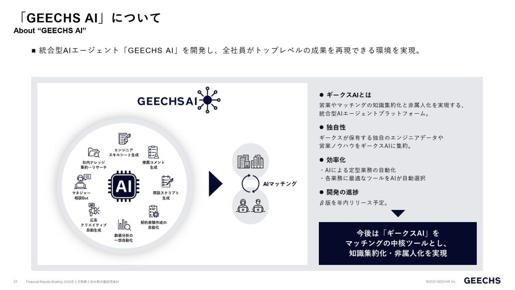 ギークスは、2025年11月に「AIとはたらく、AIでつなぐ」を掲げた「ギークス AIステートメント」を発表しました。また、独自開発の統合型AIエージェント「GEECHS AI」による事業基盤の刷新も進めています。